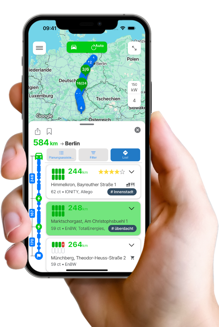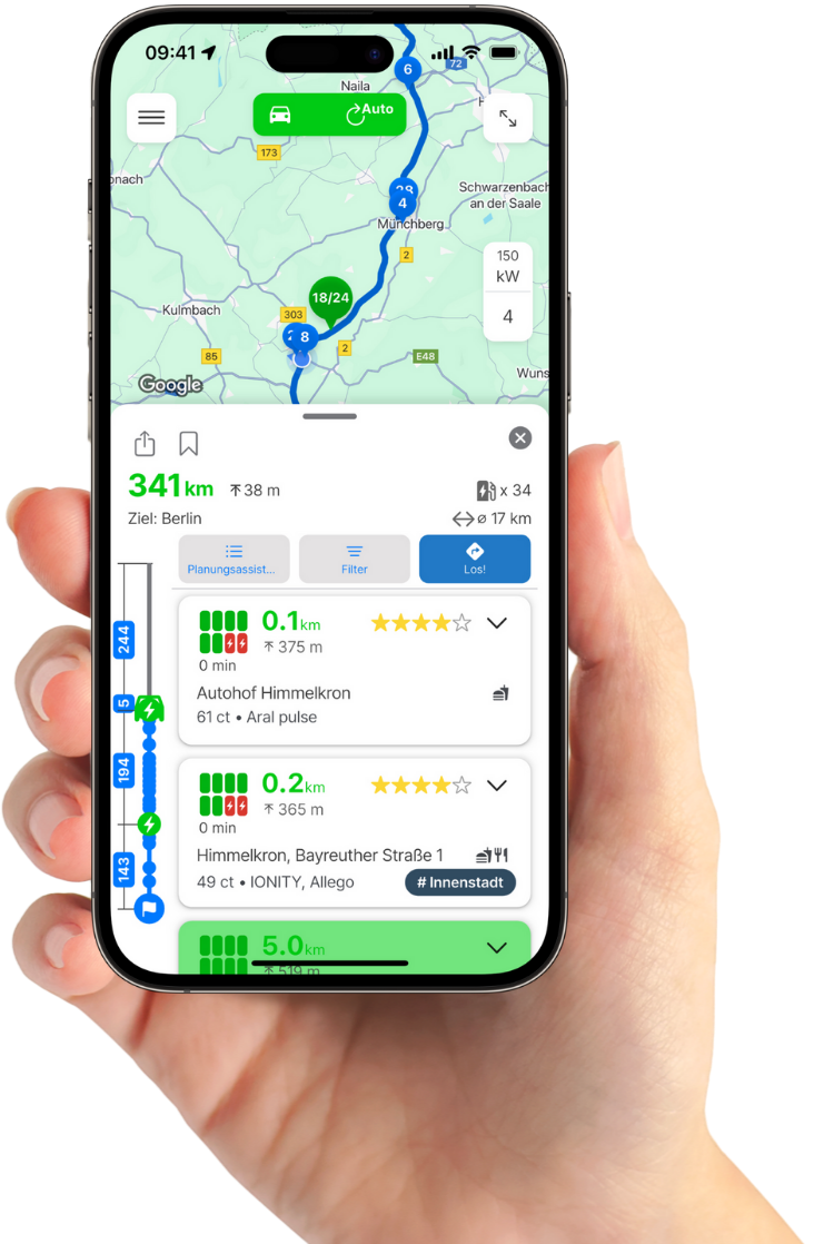 Mit einer einfachen App, finden Ihre Mitarbeitenden immer die passende Ladestation ohne Umwege entlang der anstehenden Route.